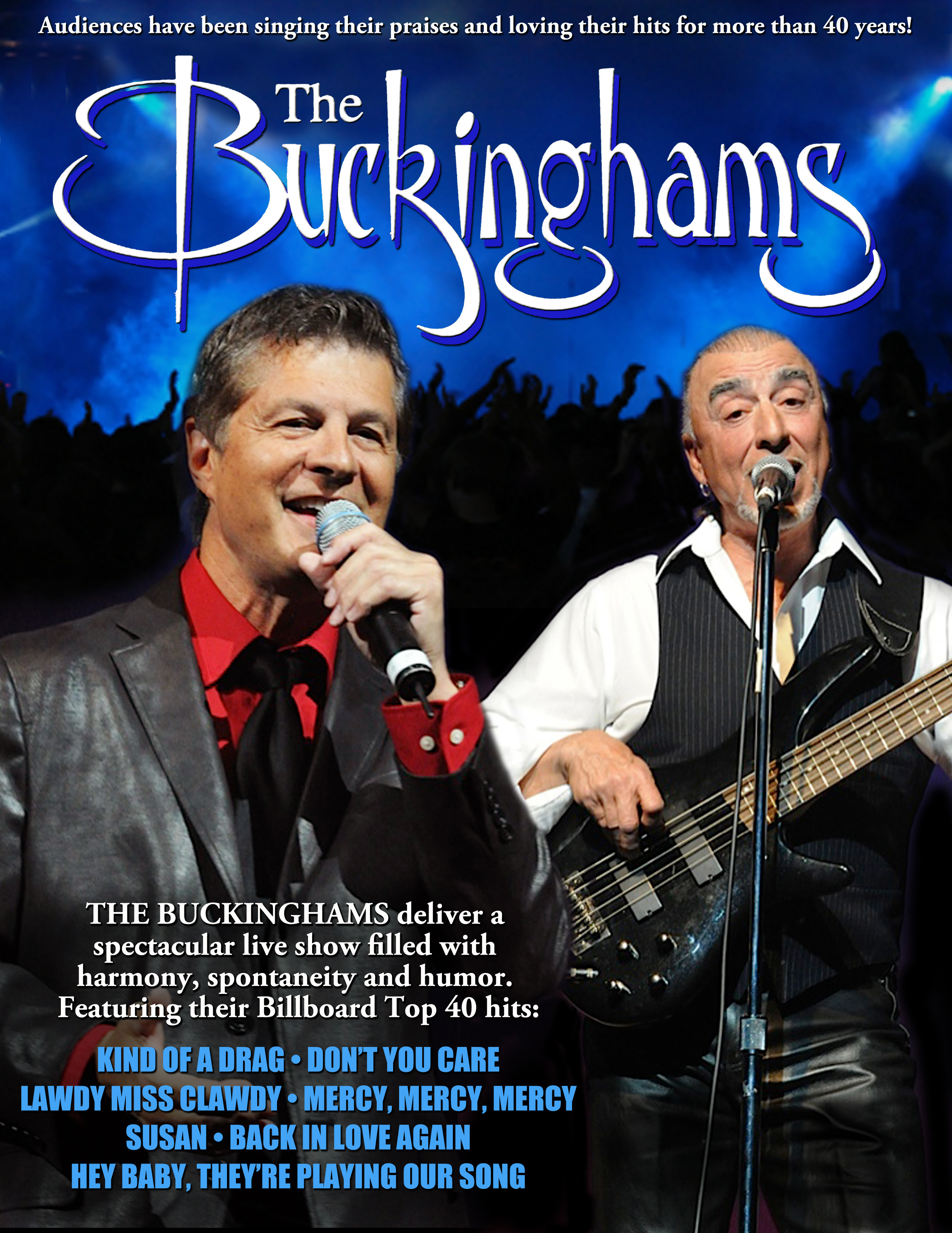 No Buckinghams show is complete without their own timeless classics, the songs that earned them Billboard Magazine’s “Most Listened to Band of 1967.” It all started with their #1 HIT “KIND OF A DRAG,” followed by 7 charted hits, with 5 in the top 10 “DON’T YOU CARE,” “MERCY, MERCY, MERCY,” “ HEY BABY THEY’RE PLAYING OUR SONG,” “SUSAN.” “ LAWDY MISS CLAWDY,” “BACK IN LOVE AGAIN,” and “I’LL GO CRAZY.”